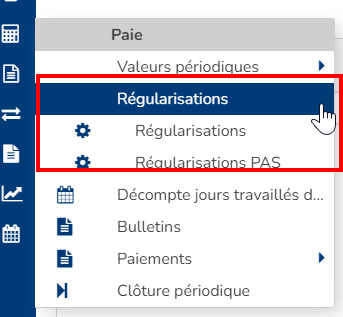 Désormais pour plus de clarté, ces menus ont été remontés d'un niveau, dans un nouveau menu Régularisations :