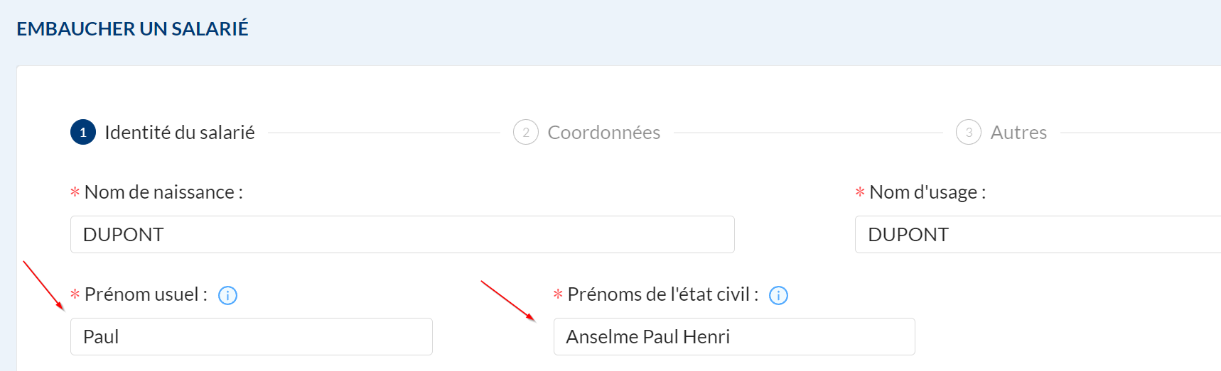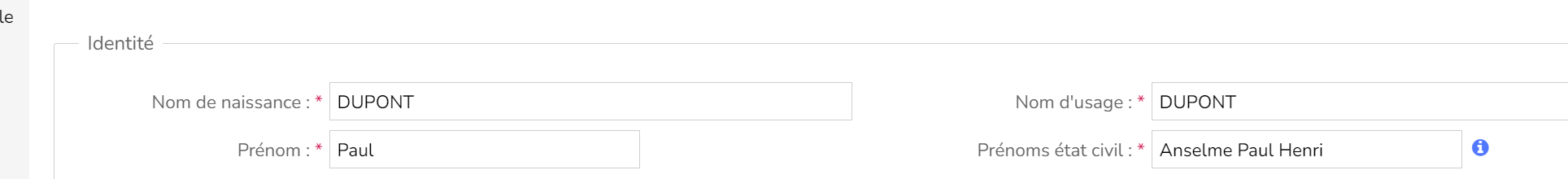 Le champ "Prénoms de l'état civil" quand à lui doit contenir au moins le 1er prénom de l'état civil, et idéalement l'ensemble des prénoms dans l'ordre de l'état civil, afin de garantir une identification optimale des individus auprès des organismes sociaux.