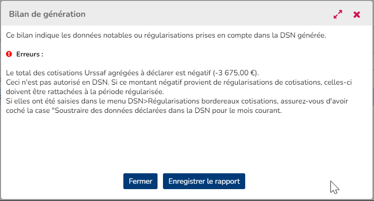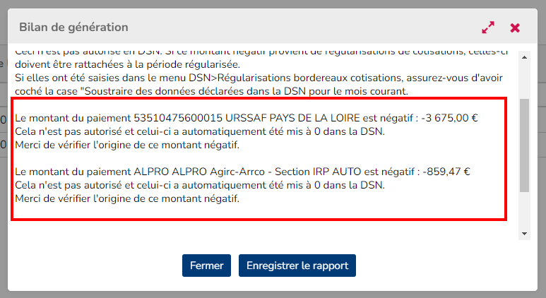 Désormais lors de la génération d'une DSN mensuelle, le bilan de génération affiche des informations supplémentaires :