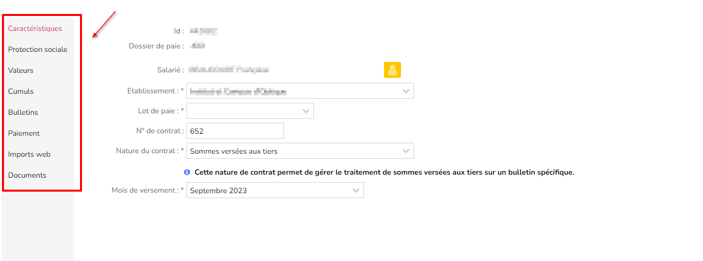 Dans la fiche Contrat, l'affichage est également adapté, et de nombreux onglets et champs sont masqués, car non pertinents dans le contexte de sommes versées à un tiers :