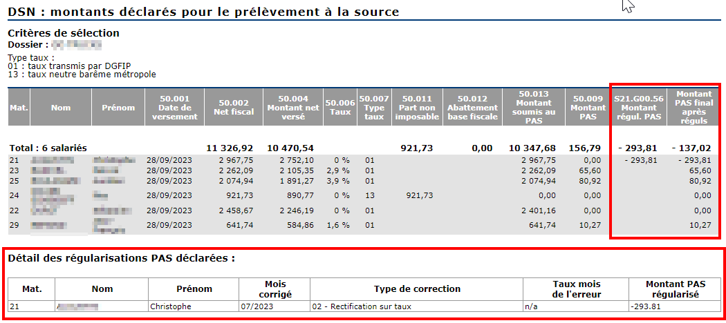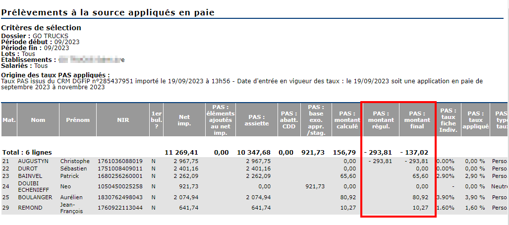 la colonne "PAS : montant final" indique le montant final du PAS prélevé après prise en compte des régularisations