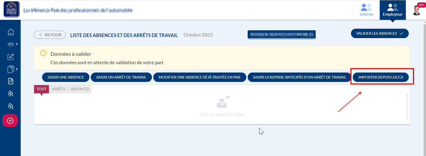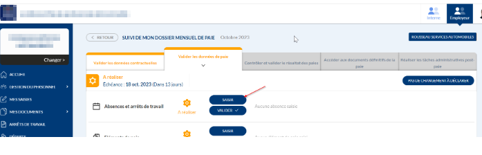 Une fois le paramétrage effectué par le support technique et la fonctionnalité activée, un nouveau bouton sera affiché dans "Valider les données de paie">"Absences et arrêts de travail"