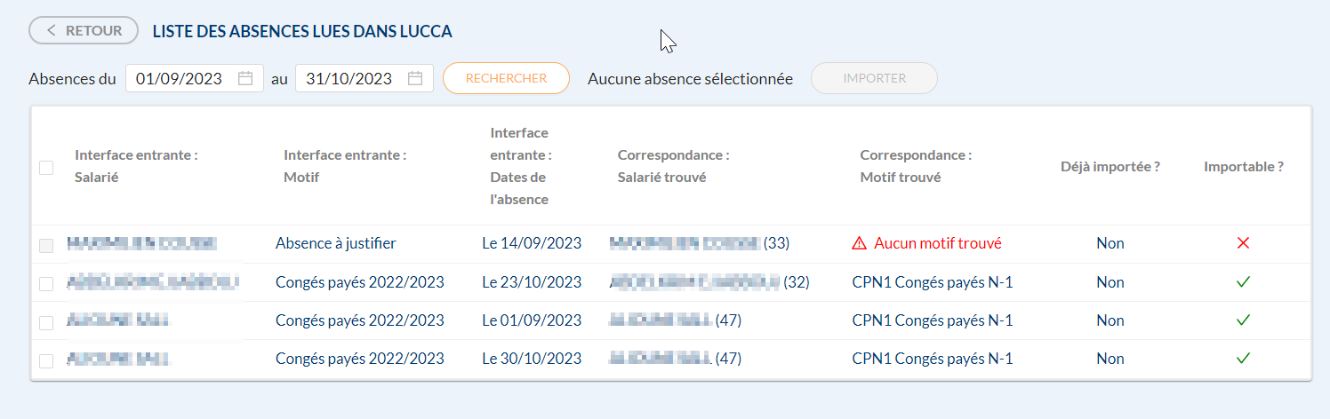 Dans cette page, indiquez ensuite une plage de dates et cliquez sur le bouton "Rechercher" : le logiciel va alors se connecter à Lucca et récupérer la liste des absences correspondant à la plage de dates :