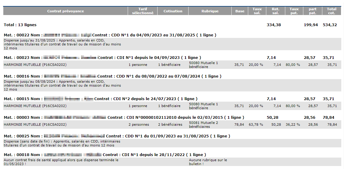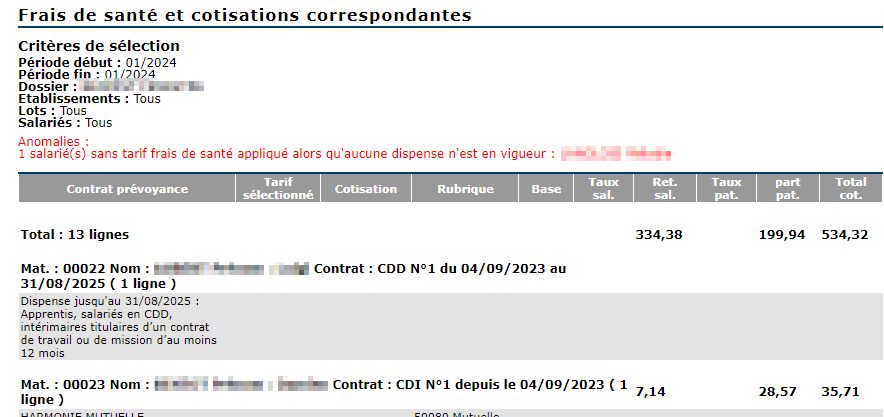 Cet état liste pour chaque salarié les tarifs frais de santé sélectionnés dans les fiches contrat de travail, et les cotisations correspondantes sur le bulletin de paie.