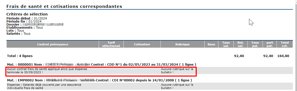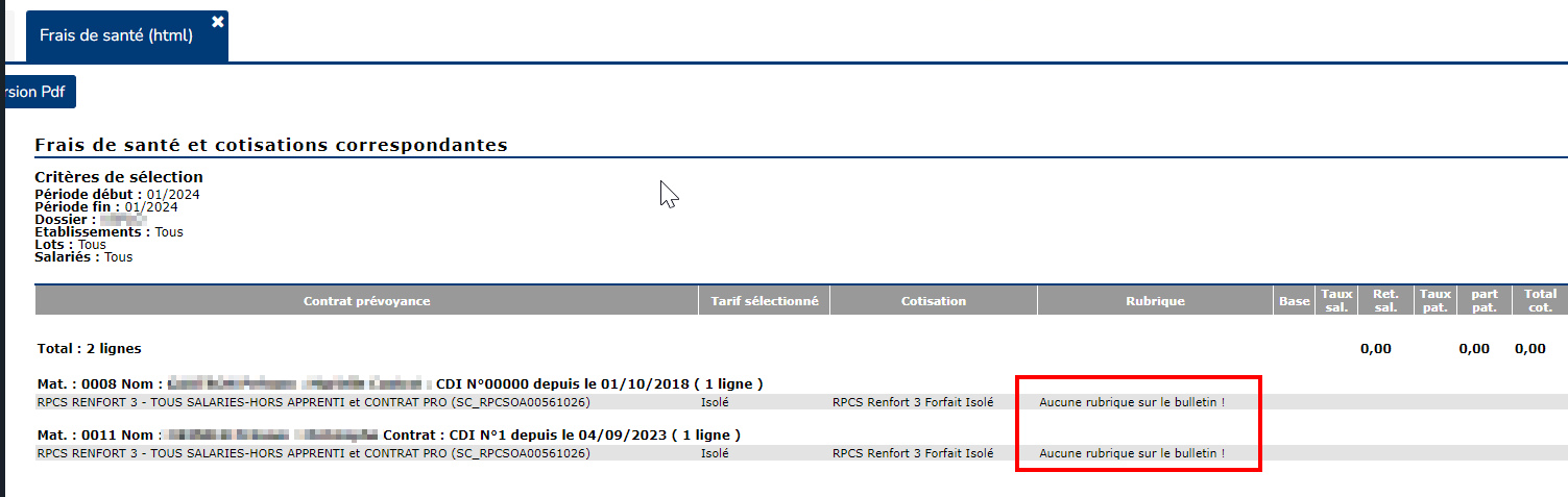 Par exemple, ici, on peut constater qu'aucune rubrique correspondant à ce tarif et contrat de prévoyance ne figure sur les buleltins :