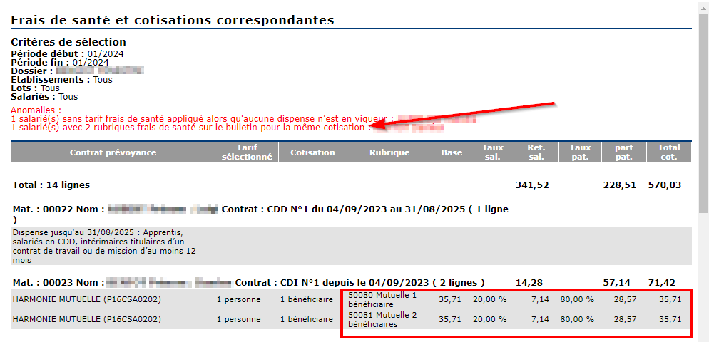 Si des rubriques se déclenchent en double pour une même cotisation, cette anomalie est également signalée :