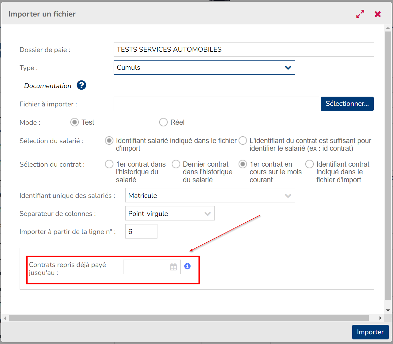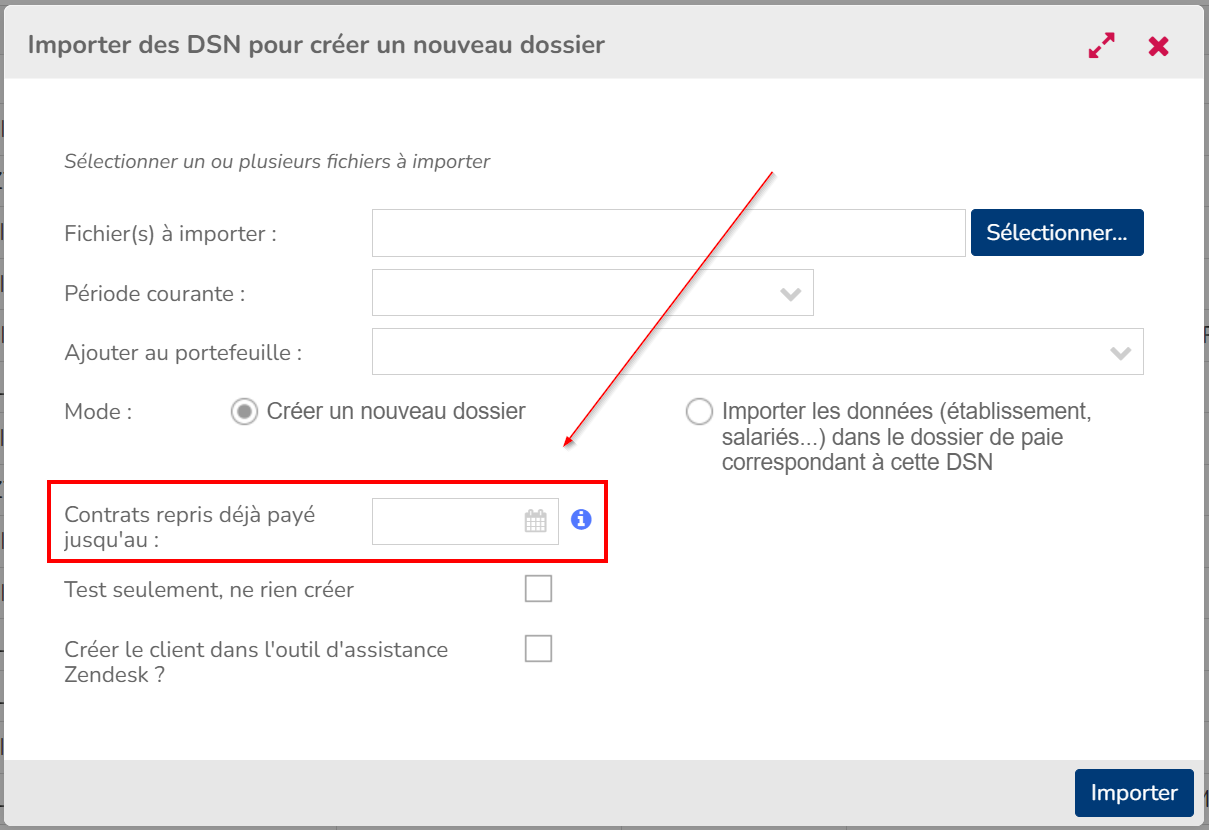 Lors de l'initialisation d'un dossier par import de fichier DSN, ou, si le dossier est déjà créé, lors d'un import de cumuls, il est désormais possible d'affecter dans tous les contrats concernés la date de "contrat repris déjà payé jusqu'au".