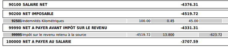 On constate également que le PAS est calculé, mais en négatif : ainsi, ici, au lieu de récupérer un net de -4 376,31 € auprès du salarié, on calcule un montant à reprendre de :