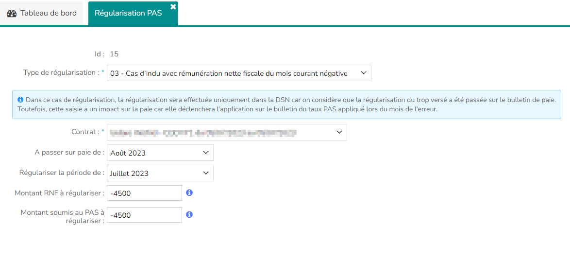 Cette régularisation PAS doit être de type "03 - Indu avec RNF négative sur le mois courant" :